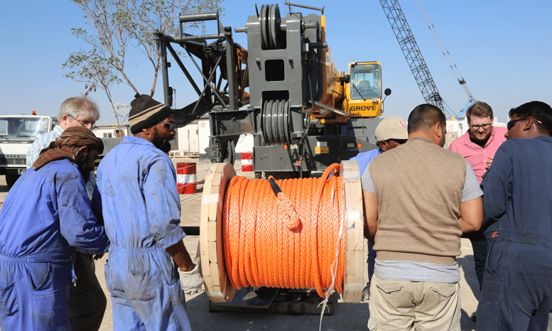 The rope was fitted at a recent three-day event, which included machine testing and hands-on training for the installation, handling, and inspection of the K-100 product, Manitowoc said in a press announcement. Samson and Manitowoc representatives attended the event, along with employees from Consolidated Contractors Company (CCC), one of the largest construction services companies in the region and the operator of the Grove RT880E.