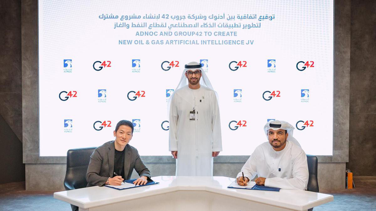 The Abu Dhabi National Oil Company (ADNOC) has inked a deal with Group 42 (G42) to set up a JV to develop and commercialise AI products for the oil and gas industry.