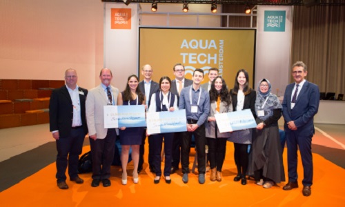 At a special event held during Aquatech 2019 in Amsterdam, the first-place trophy was handed to the ‘Molding the Future with Salt’ project by Sebastian Castano (Colombia), Shihan Lou (China), Indah Puspita (Indonesia), and Nouran Bahgat (Egypt) from the Wetsus Academy in the Netherlands, who proposed a circular solution for brine, using technology to create a new, eco-friendly building material.