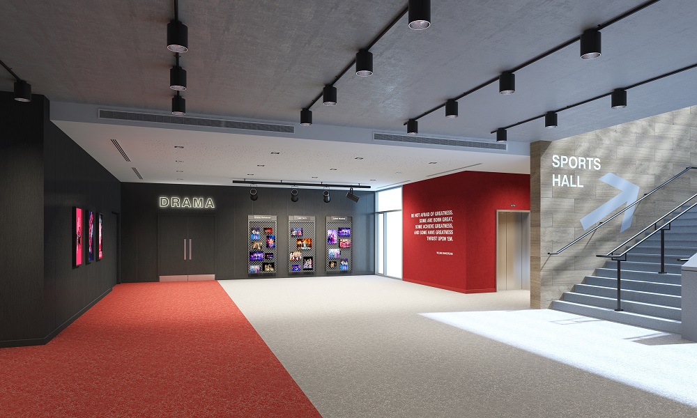 At the heart of the facility a ‘red carpet’ will lead guests and students to a central lobby and the music and drama department. From this lobby students will be able to access the new music classrooms and practice rooms as well as drama studios on one side and the main black box theatre on the other side.