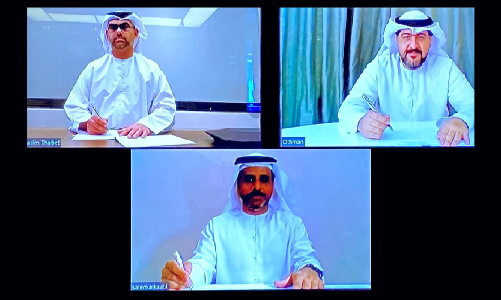 Jasim Husain Thabet, CEO and managing director of AD Power signed the Memorandum of Understanding with Othman Al Ali, CEO of EWEC and Dr Salem Al Kaabi, general manager of Tadweer.