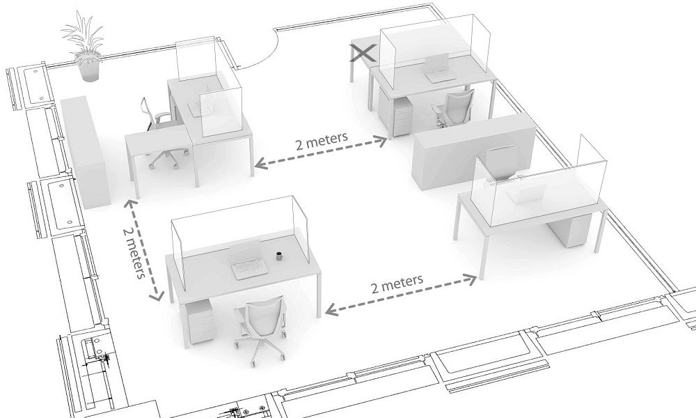 • Social distancing is the reality of our new workplaces. Where employees sit and work, and meet will need to be carefully planned to ensure social distancing. This can include re-configuring entire floorplans, moving workstations/desks and furniture to ensure social distancing, and adding desk partitions/screens.