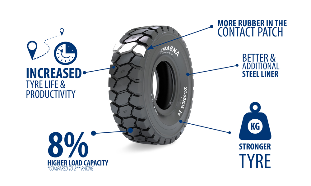“The next level Magna MA04+ ensures customers a stronger tyre, with more rubber in the contact patch, and better and additional steel liners, which will result in increased load capacity. It allows mining operators to increase the productivity and continuity of their earthmoving operations,” said Magna.