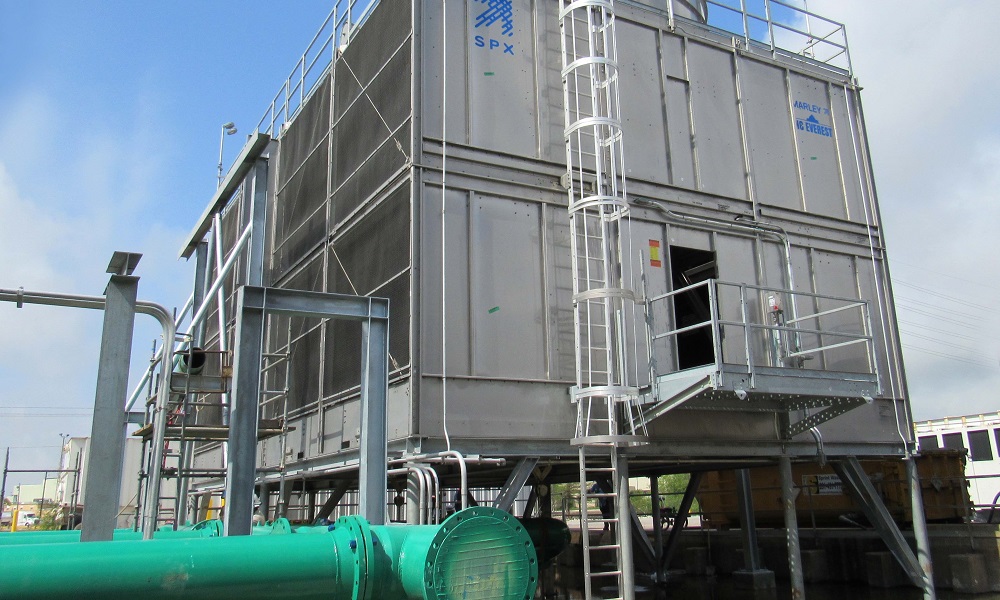 Cooling towers evaporate an HVAC system’s recirculated water to remove heat. Only small amounts of water are required to be recirculated through the system. Water in the evaporative cooling tower mixes with air flow – typically produced by a fan (often using a variable frequency drive to save energy); evaporation of the hot water results, creating a cooling action.