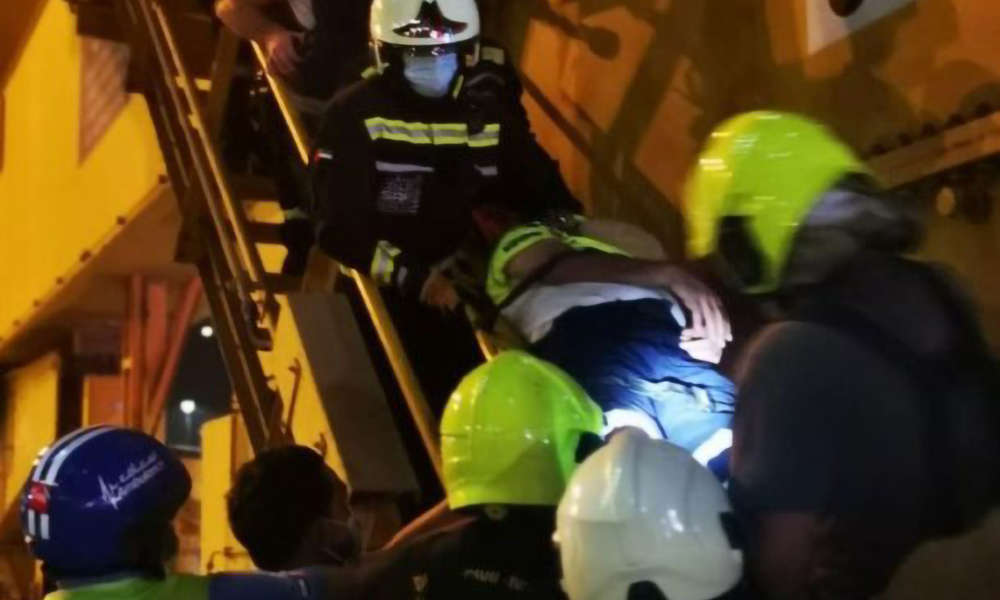 “The most difficult challenge was bringing the man down swiftly and safely as the crane’s lift had broken down. Our teams of technicians had to repair the lift and operate it manually before we lifted the man down to the first floor where he was then placed on a stretcher and carried down to the ambulance,” Lt Col Mohammad was quoted as saying.