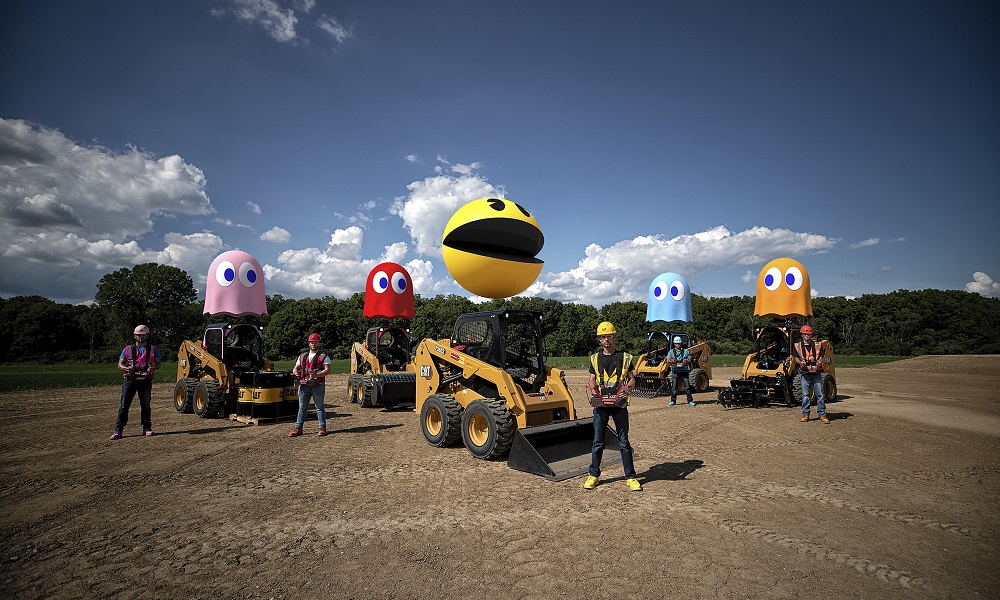 PAC-MAN….Cat-style. With the help of skilled operators, Cat built a life-sized game board using its latest machines, attachments and technology. The players include Cat customers, expert operators and gamers, who used remote controls to operate the Cat skids-teer loaders playing the parts of the giant PAC-MAN and the ghosts.