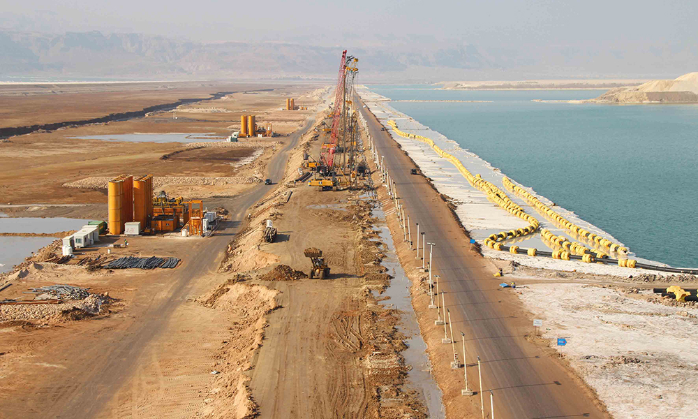 Bauer International FZE, a subsidiary of Bauer Spezialtiefbau GmbH, was commissioned by the Arab Potash Company of Jordan to build the dikes in 2018. According to a press release from Bauer, the project actually started in April 2019 and posed several challenges, one of which was that it had to be carried out in just 16 months and another the complicated logistics, mobilisation of specialist staff, harsh weather conditions, extremely salty environment and other allied factors.