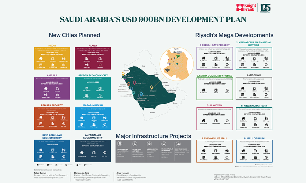Faisal Durrani, Partner – Head of Middle East Research at Knight Frank explained: “Saudi Arabia is a country being reborn. The ambition that underpins Vision 2030 is being borne out in reality and we are rapidly closing in on US$ 1 trillion of developments, all of which are colossal. And this is only about a third of the total spend planned.