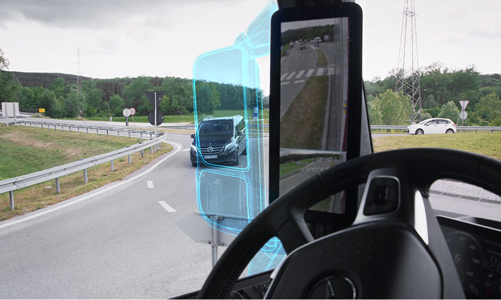 The new Mercedes-Benz Actros with MirrorCam. By eliminating the classic mirror, full view through the side window.The marked area illustrates the visual gain.