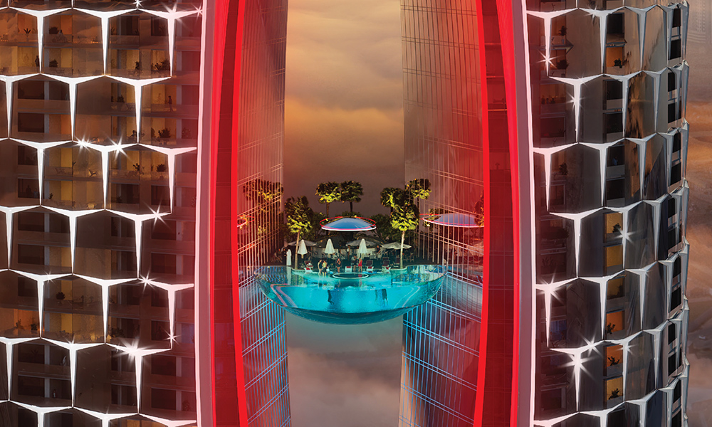 Designed as one, both towers will be interlinked at the base, middle and crown by unique defining features, including a ‘ruby heart’ at the centre, up on the 60th floor, which will feature a floating pool with views of the Dubai skyline.