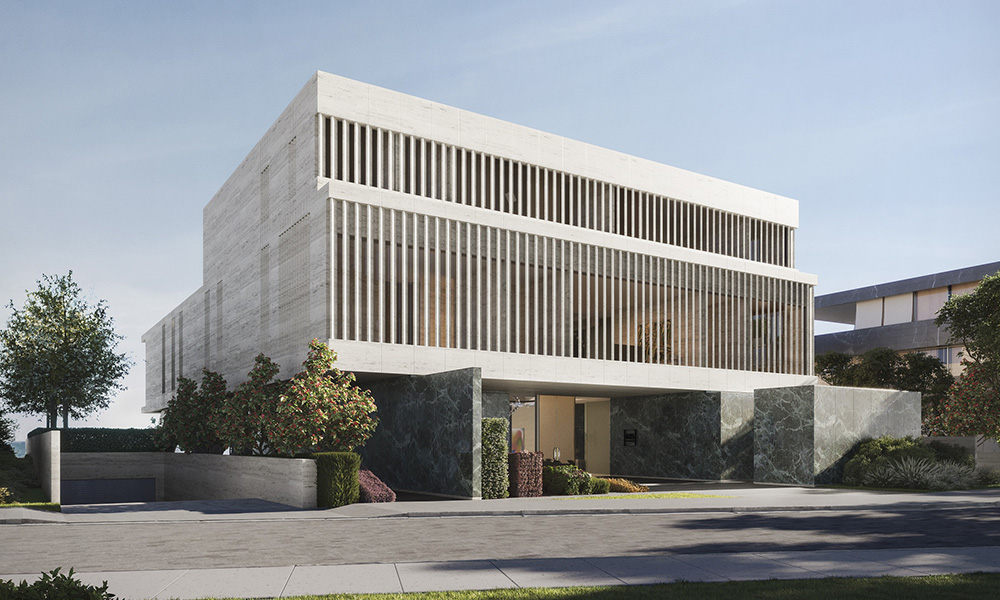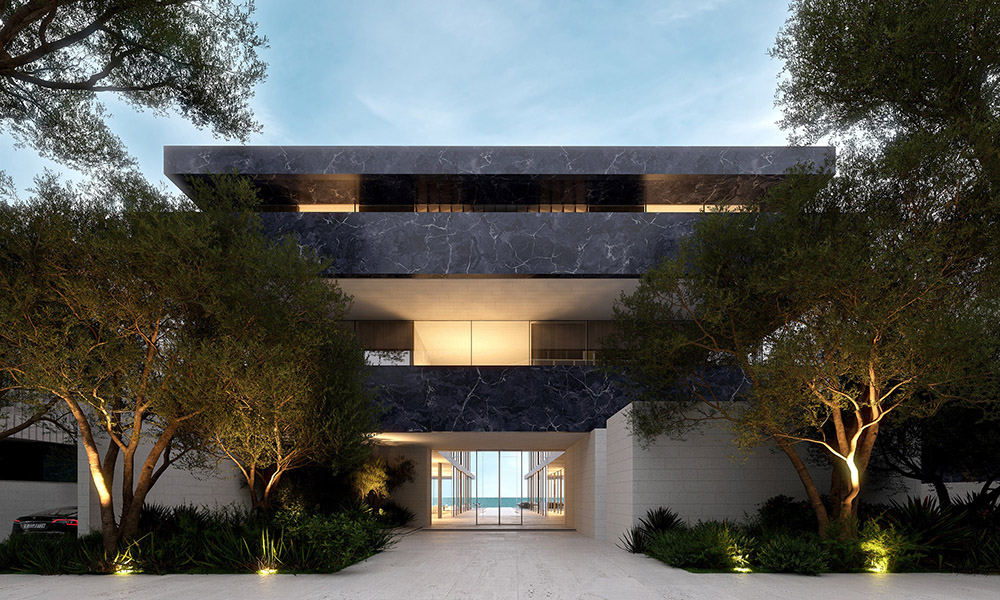 The earth mansion’s minimalist architecture is said to represent a space in constant dialogue with its surroundings, hidden from the street yet open toward the water view. Floor-to-ceiling sliding glass allows for expansive views, seamlessly merging the patio and living rooms to transform into one wide reception area when open. The beautiful waterfront views are elegantly framed from the moment they are seen from the lobby, the developer remarked.