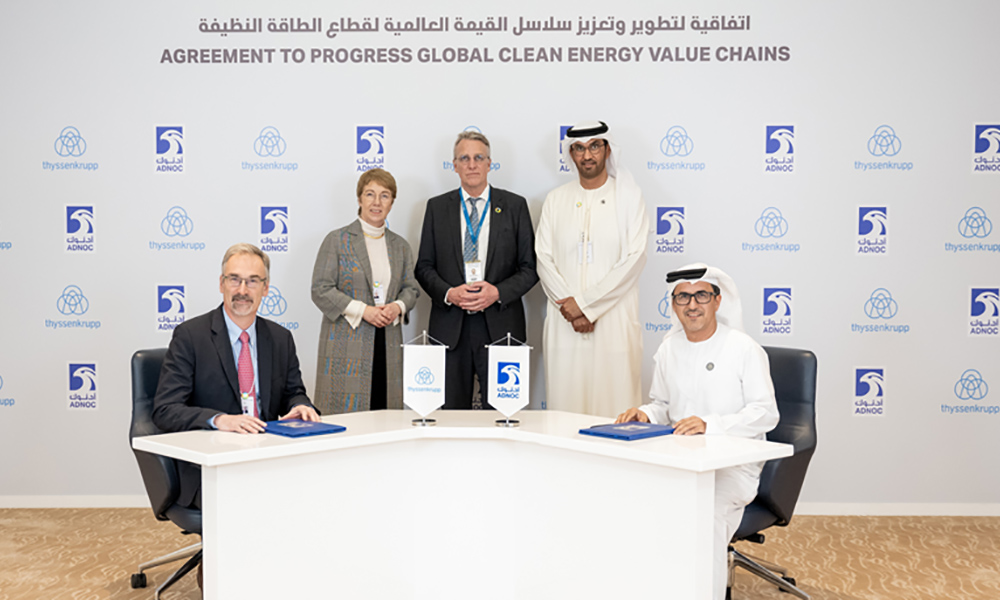ADNOC has signed a Memorandum of Understanding (MoU) with thyssenkrupp Uhde – the German-based subsidiary of thyssenkrupp Group and a specialist in chemical engineering – to explore a long-term partnership to create new markets for hydrogen and promote global clean energy value chains.